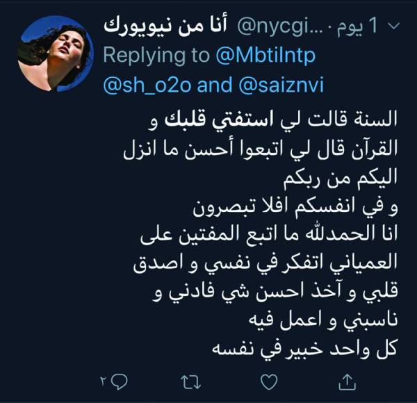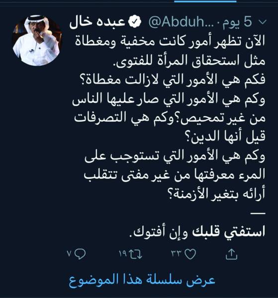 ويقول الكاتب والروائي عبده خال: «الآن تظهر أمور كانت مخفية ومغطاة مثل استحقاق المرأة للفتوى. فكم هي الأمور التي مازالت مغطاة؟ وكم هي الأمور التي صار عليها الناس من غير تمحيص؟ وكم هي تصرفات قيل إنها الدين؟ وكم هي الأمور التي تستوجب على المرء معرفتها من غير مفتٍ تتقلب آراؤه بتغير الأزمنة؟ استفت قلبك وإن أفتوك».