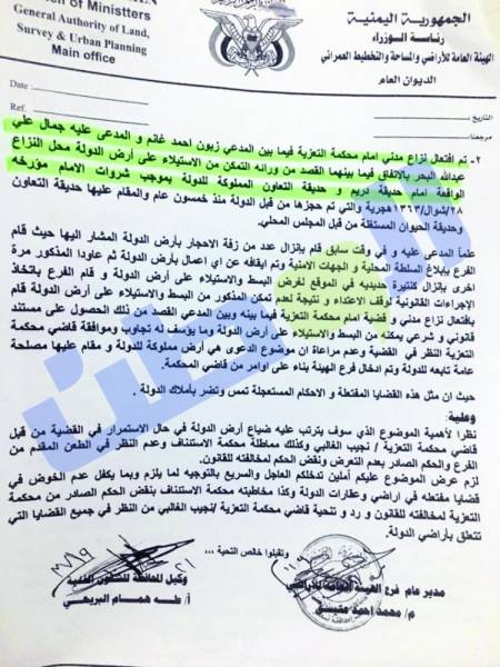 أضاف المصدر أن الأرض تعتبر ملكا في الأصل للمدعو جمال علي عبدالله البحر، صاحب ومالك الأرض الأساسي، والمدعي ظلما وزورا هو الحوثي زبون أحمد غانم، وقام الأخير بوضع مجموعة من الأحجار في الأرض المملوكة للمواطن في محاولة لاستفزازه، ليحضر على الفور المدعى عليه للموقع، ونشب خلاف بينه وبين الحوثي استدعى تحويل القضية إلى المحكمة التعزية، وأبرز المدعى عليه ومعه وثيقة تملك الأرض، ليصدر فورا قرارا شرعيا من المحكمة التعزية يقضي بتملك الموطن للأرض وصرف النظر عن دعوى المدعي الحوثي. واستدرك المصدر أن القيادي الحوثي الذي يرغب في تملك الأرض بالقوة قام بمهاجمة القاضي في المحكمة التعزية نجيب الغالبي، واتهم محكمة الاستئناف بالمماطلة وعدم النظر في الطعن المقدم من الفرع، ومطالبته بنقض الحكم وعدم نظر المحاكم مستقبلا في قضايا متعلقة بالأراضي وعقارات الدولة، مشيرا إلى أن تلك الأحكام القضائية مخالفة للقانون، وجرى منع القاضي نجيب الغالبي من النظر في أي قضايا تلامس الدولة.