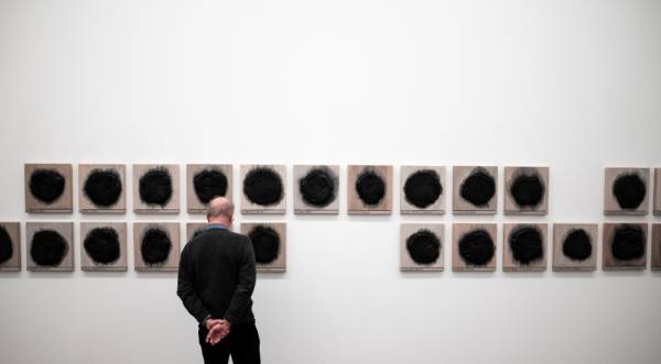 زائر يلقي نظرة على عمل «تحية» من معرض لأعمال إروين بيشتولد في متحف Kueppersmuehle. (د ب أ).