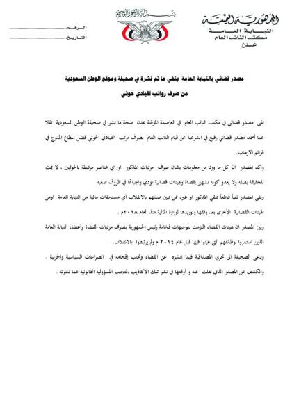 مع تقديرنا لبيان المصدر القضائي في النيابة العامة، وضمانا لحق الرد، تنشر الصحيفة البيان كاملا، على الرغم من عموميته وإنشائيته، وعدم إيراد أي معلومة أو تفاصيل حقيقية تدعم البيان، وقامت النيابة بتوزيع الرد على المواقع اليمنية قبل إرساله إلى الصحيفة، وكأن الهدف ليس الرد للصحيفة، وإنما لأوساط أخرى. وعلى كل حال، فإن الفيصل في هذه الأمور هو الكشوفات الأساسية للحوالات البنكية التي صُرفت عن طريق بنك الجزيرة في صنعاء، والاحتكام إليها يكشف حقيقة الأسماء المصروف لها، وتنجلي الحقيقة، علما بأن الصحيفة تحترم الهيئات القضائية، وتثمّن جهودها الكبيرة التي تؤدي عملها في ظروف صعبة واستثنائية، وسط تغوّل الممارسات الحوثية الهمجية، واستخدامها الفساد والإفساد لتشويه سمعة النزهاء العدول والشرفاء في جميع مكونات الشرعية.