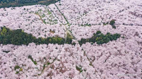 صورة جوية لمناظر ربيعية رائعة لأزهار الكرز بمقاطعة قويتشو بالصين (شينخوا)