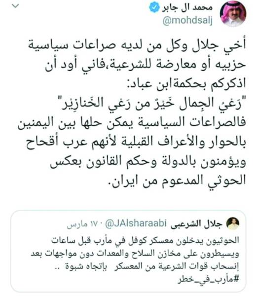 كان الإعلامي اليمني جلال الشرعبي غرد بقوله «الحوثيون يدخلون معسكر كوفل في مأرب قبل ساعات ويسيطرون على مخازن السلاح والمعدات دون مواجهات بعد انسحاب قوات الشرعية من المعسكر باتجاه شبوة»، ورد عليه السفير آل جابر بتغريدة قال فيها «أخي جلال وكل من لديه صراعات سياسية حزبية أو معارضة للشرعية، فإني أود أن أذكركم بحكمة ابن عباد: «رعي الجمال خير من رعي الخنازير .. فالصراعات السياسية يمكن حلها بين اليمنيين بالحوار والأعراف القبلية لأنهم عرب أقحاح ويؤمنون بالدولة وحكم القانون بعكس الحوثي المدعوم من إيران».