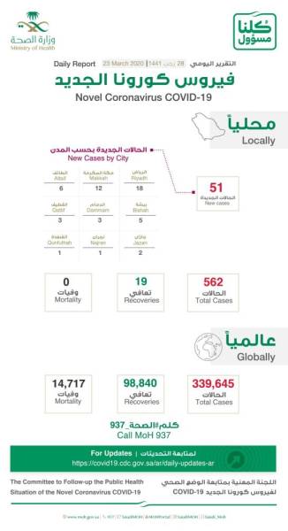 وبين أن عدد الاستفسارات والاستشارات على مركز اتصال الصحة 937 بخصوص فيروس كورونا الجديد تجاوزت 280 ألفا.
