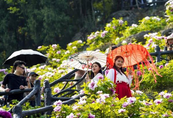 أشخاص يلتقطون الصور في حديقة الفاوانيا بمنطقة ديانجيانج، بلدية تشونجتشينج، جنوب غرب الصين. (شينخوا)
