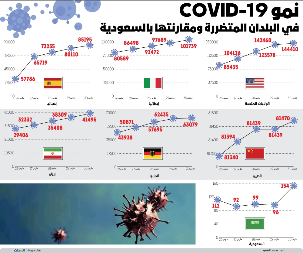 نمو COVID-19 في البلدان المتضررة ومقارنتها بالسعودية