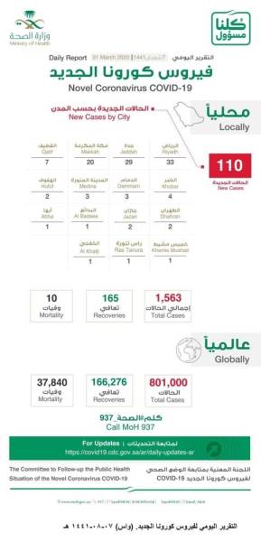 وأشار إلى أنه تعافت 50 حالة جديدة بالمملكة ليصل العدد إلى 165 حالة.