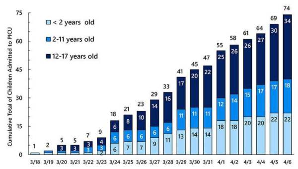 ووفقًا لسجل أمريكا الشمالية (Virtual PICU Systems)، تم إدخال 74 طفلًا في الولايات المتحدة إلى PICUs بين 18 مارس و6 أبريل، مما يشير إلى احتمال إصابة 176.190 طفلًا إضافيًا خلال هذا الإطار الزمني. ويمثل الأطفال الذين تقل أعمارهم عن عامين 30% من الحالات، و 24 % لمن تتراوح أعمارهم بين 2 و 11 سنة و 46 % من حالات وحدة العناية المركزة للأطفال الذين تتراوح أعمارهم بين 12 و 17 عامًا. ويقول الباحثون إنه إذا أصيب ما يصل إلى 25 % من سكان الولايات المتحدة بالعدوى قبل نهاية عام 2020، سيتعين إدخال 50.000 طفل مصاب بمرض شديد إلى المستشفى، منهم 5400 يعانون من أمراض خطيرة ويتطلبون تهوية ميكانيكية. كما تشير التقارير السريرية إلى أن متوسط مدة الإقامة لـ COVID-19 للأطفال هو 14 يومًا. وفقًا لمسح وطني يهدف إلى تقييم قدرة الرعاية الحرجة للأطفال في الولايات المتحدة ونشرها في طب الرعاية الحرجة، وأن هناك ما يقرب من 5100 سرير PICU في الولايات المتحدة.
