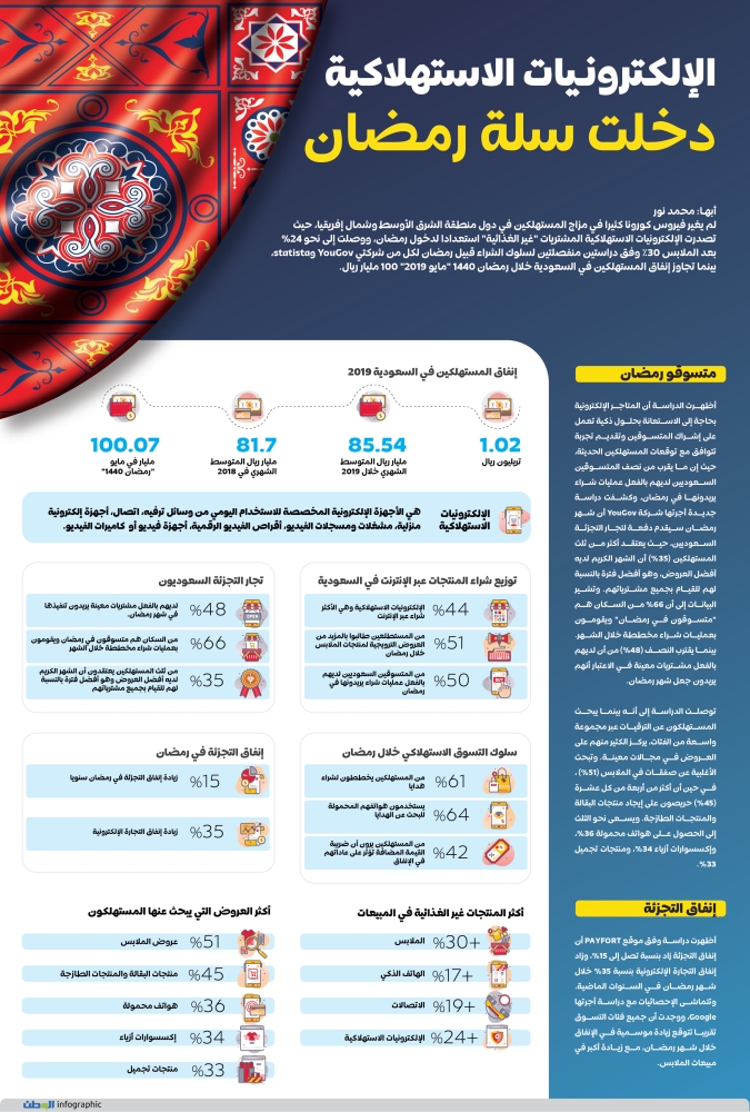 أظهرت دراسة وفق موقع PAYFORT أن إنفاق التجزئة زاد بنسبة تصل إلى 15%، وزاد إنفاق التجارة الإلكترونية بنسبة 35% خلال شهر رمضان في السنوات الماضية. وتتماشى الإحصائيات مع دراسة أجرتها Google، ووجدت أن جميع فئات التسوق تقريبا تتوقع زيادة موسمية في الإنفاق خلال شهر رمضان، مع زيادة أكبر في مبيعات الملابس.