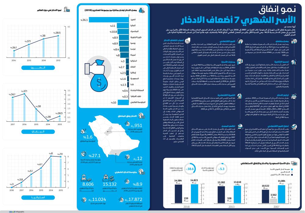 لفت التقرير إلى تناقص في معدل الادخار على مستوى الأسرة في المملكة، وذلك على الرغم من ارتفاع متوسط الدخل الشهري في عام 2018 للأسرة بنسبة 5,3% بمعدل (14823ريالاً شهرياً) مقارنة بالعام 2007م مع ارتفاع الإنفاق الاستهلاكي الشهري للأسرة بنسبة 38,6 في المائة بمعدل (14584ريالا) وبشكل عام فإنَّ أغلب اقتصادات العالم شهدت في الآونة الأخيرة انخفاضاً في معدلات الادخار الأسري ولكن بوتيرة أقل باستثناء بعض الاقتصادات المتقدمة، مثل: ألمانيا (11%).