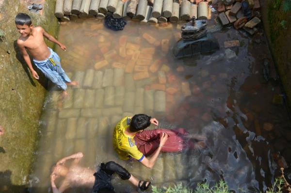أطفال يستمتعون بالمياه المتسربة من أنبوب الإمداد خلال يوم صيفي حار في مدينة روالبندي. (أ ف ب)