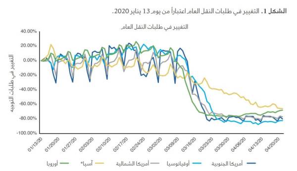 كشفت ورقة "تأثير فيروس كورونا الجديد على الطلب على النقل والبنزين" تراجع الطلب على قطاع النقل في العالم بنسبة لا تقل عن 50% جراء عمليات الإغلاق التي شهدها العالم، للحد من انتشار الجائحة. أوضحت تقارير توجهات التنقل في خرائط آبل انخفاض الطلب على وسائل النقل العام على مستوى العالم بما يتراوح ما بين 75% و80%.