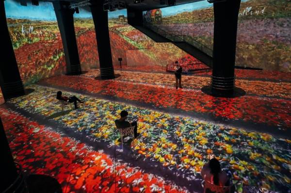 زوار خلال مشاهدة عرض «تجربة غامرة» لمحاكاة الواقع، بصالة هورتا في بلجيكا. (شينخوا)