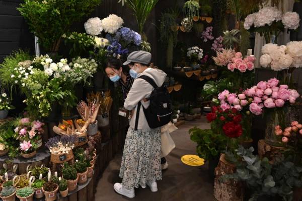 متسوقون للزهور داخل متجر سيلفريدجز بعد عودة الحياة في لندن (أ ف ب)