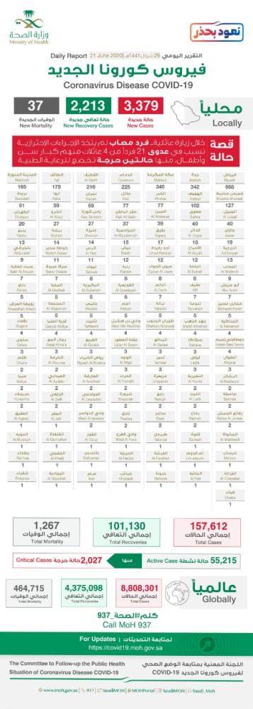 أشار إلى أن عدد المتعافين وصل إلى (101130) حالة، بإضافة (2213) حالة تعاف جديدة، وبلغ عدد الوفيات (1267) حالة، بإضافة (37) حالة وفاة جديدة، كما بلغ إجمالي الفحوصات في المملكة (1346641) فحصا مخبريا دقيقا، بإضافة (35656) فحصا جديدا.