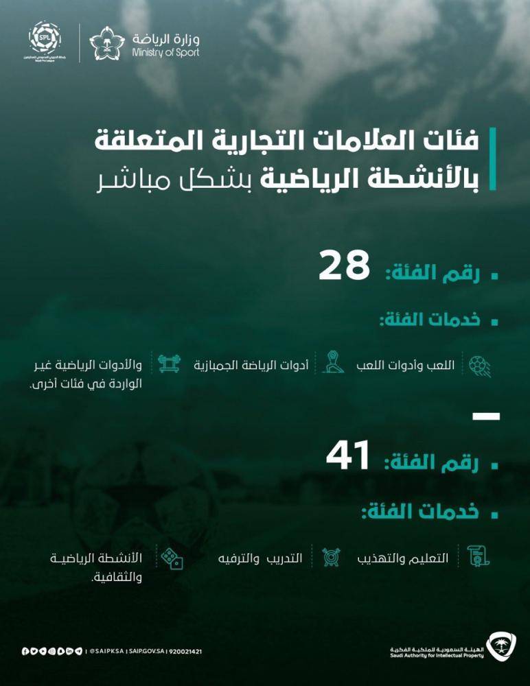 أوضحت الهيئة السعودية للملكية الفكرية إجراءات تسجيل العلامة التجارية للأندية الرياضية، وفئات العلامات التجارية المتعلقة بالأنشطة الرياضية بشكل مباشر.