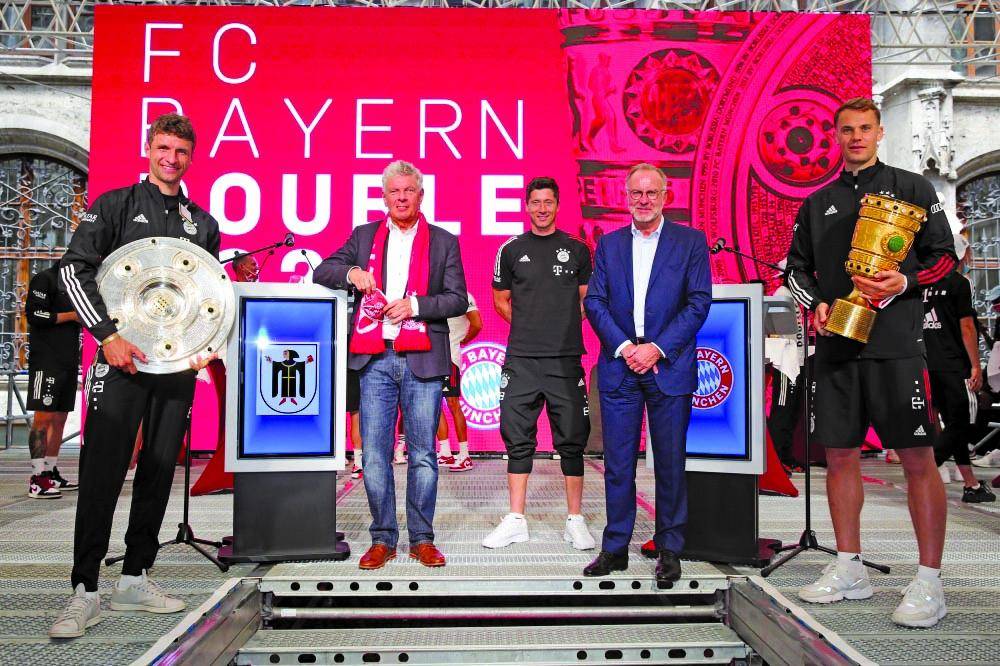ولم يكن اللاعبون يرتدون الزي البافاري التقليدي كما كان الحال في الأعوام السابقة، ولكن بدلاً من ذلك كانوا يرتدون ملابس رياضية، فيما ارتدى المدرب هانسي فليك قميصا خاصا بالثنائية المحلية الثالثة عشر. وبينما احتشد ما يقرب من 15 ألف مشجع في ساحة مارينبلاتز، احتفالا بتتويج بايرن بالثنائية في الموسم الماضي، لكن لم يكن هناك سوى عدد من الجماهير.
