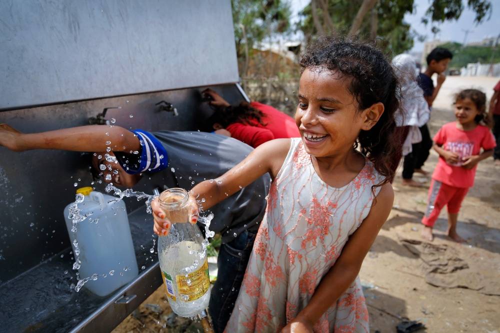 أطفال فلسطينيون يلعبون وهم يعبئون الزجاجات بمياه الشرب في بيت حانون شمال قطاع غزة. (أ ف ب)