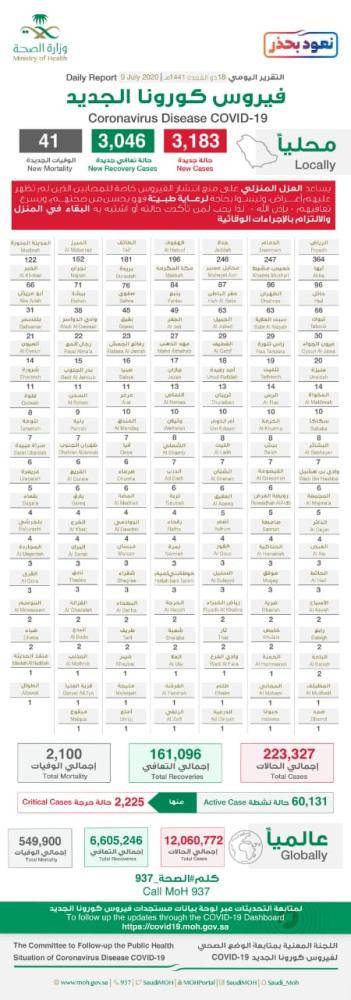 وكشفت الوزارة أن عدد الحالات النشطة بلغ 60131 والحالات الحرجة 2225 حالة .