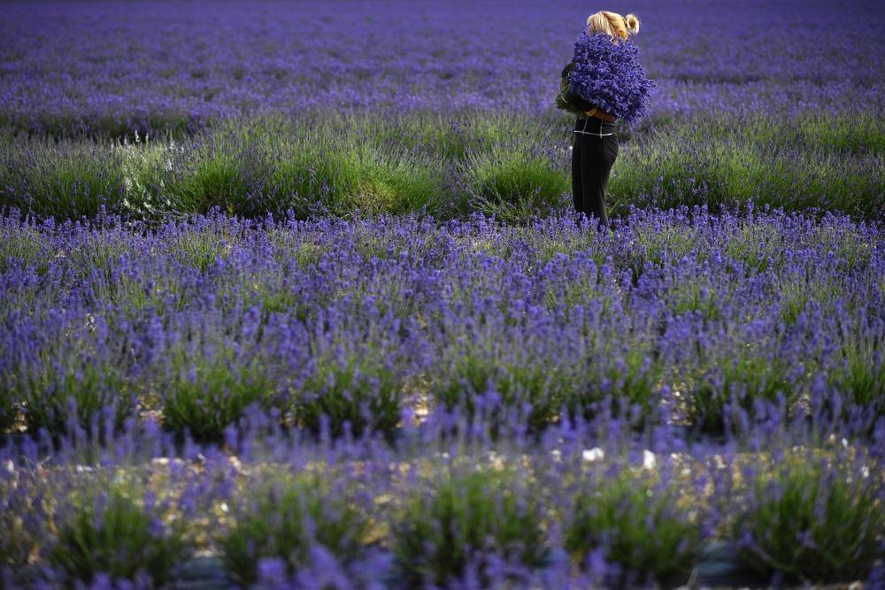 في جنوب شرق إنجلترا، عاملة تجمع الخزامى على مقطورة بعد حصاده يدويًا، حيث زادت مبيعات منتجات الخزامى مع الأشخاص الذين يحاولون التخلص من التوتر في ظل الظروف الراهنة. (أ ف ب)