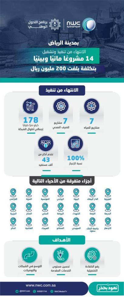 وأوضحت أن هذه المشروعات المنجزة تضمنت تنفيذ خطوط وشبكات وتوصيلات للمياه والصرف الصحي بإجمالي أطوال بلغت 178 كيلومترًا طوليًا، جاء نصيب المياه منها بعدد 7 مشاريع بطول 30 كيلومترًا طوليًا، وعدد 7 مشاريع للصرف الصحي بطول 148 كيلومترًا طوليًا، مؤكدة أن هذه المشاريع سيكون لها أثر مباشر في تعزيز ورفع القدرة التشغيلية لمنظومة خدمات المياه والخدمات البيئية في مدينة الرياض.