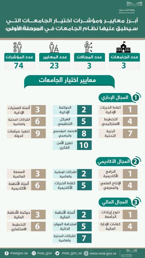 وأضاف أن "مجلس شؤون الجامعات اعتمد 23 معياراً و74 مؤشراً لتحديد مدى جاهزية الجامعات لتطبيق نظام الجامعات عليها؛ وفق ثلاثة مجالات تشمل الجوانب الأكاديمية، والإدارية والمالية، وشُكلت لجنة للمراجعة والفحص والتدقيق تضم خبراء من عدد من الجامعات لعملية تحليل الجاهزية، مشيراً إلى أنه شكلت لجنة في الأول من شعبان الماضي ضمت عدداً من المتخصصين في القياس والتقويم، وإدارة التعليم الجامعي، لتحكيم التقارير الذاتية التي ترد من الجامعات ومراجعتها، وجاء الاختيار للجامعات الثلاث بناءً على أعلى نسبة من المعايير والمؤشرات المعتمدة.