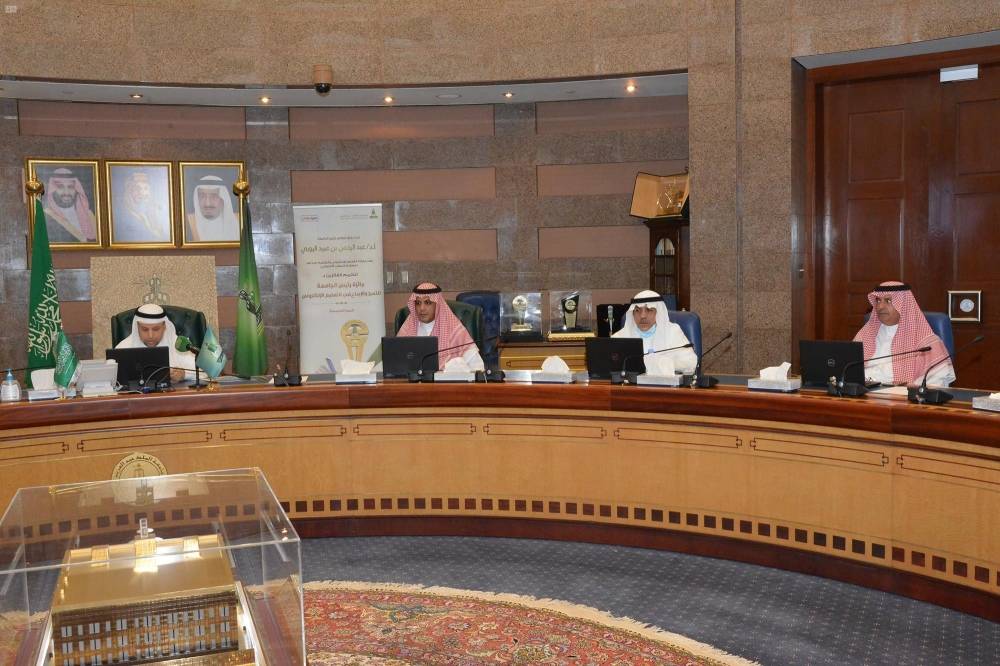 كرم رئيس جامعة الملك عبدالعزيز الدكتور عبدالرحمن اليوبي، الفائزين بجائزة رئيس الجامعة للتميز والإبداع في التعليم الإلكتروني في دورتها الخامسة، بحضور وكلاء الجامعة، والعمداء وعدد من أعضاء هيئة التدريس والطلبة، وذلك بقاعة مجلس الجامعة.