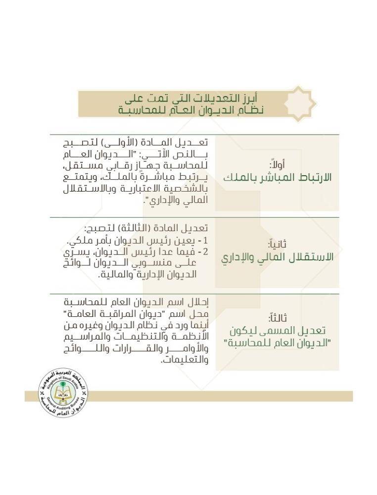 وأشـار العنقري أن هذه التعـديلات تأتي لتتوافق مع ما نصت عليه المعايير المهنية الدولية الصادرة عن المنظمة الدولية للأجهزة العليا للرقابة المالية العامة والمحاسبة (الإنتوساي)، كما أنها تأتي لتحقيق مقتضى الفقرة (الأولى) من قرار الجمعية العامة للأمم المتحدة رقم (أ/66/209) وتاريخ 22/12/2011م الذي نص على أن "الأجهزة العليا للرقابة لا يمكن لها أن تؤدي مهامها بموضوعية وفعالية إلا إذا كانت مستقلة عن الجهة الخاضعة للمراجعة، وتتمتع بالحماية من التأثير الخارجي".