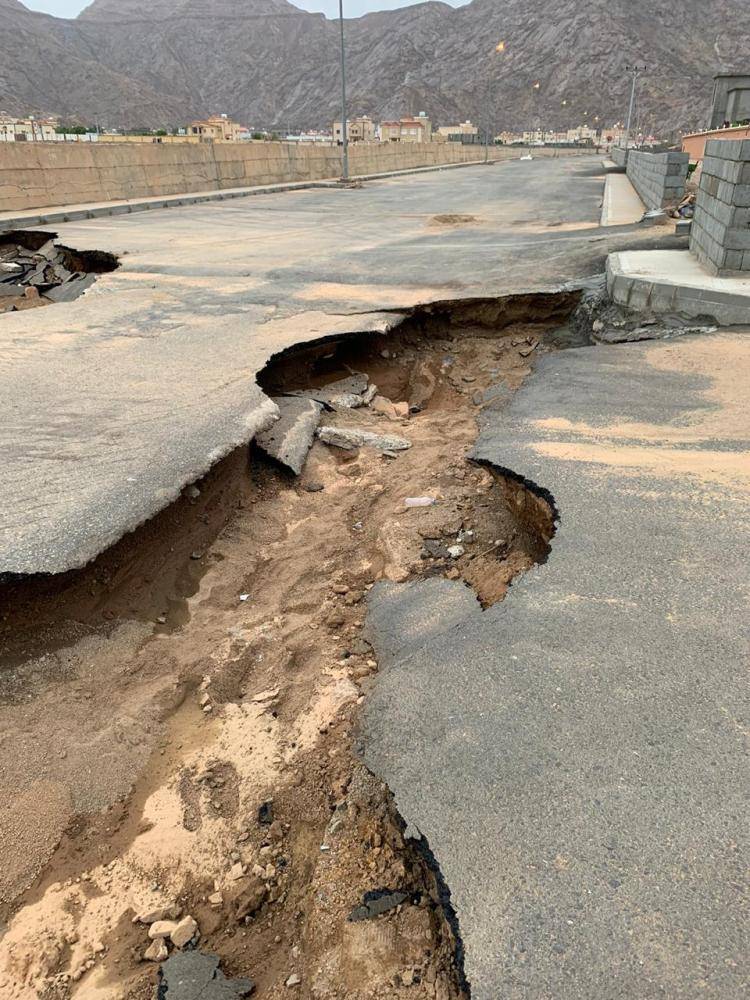 انهار عدد من الطرق الإسفلتية بحي الحضن (نهيقة) بمنطقة نجران، نتيجة السيول التي خلفتها الأمطار الغزيرة التي تعرضت لها المنطقة. (تصوير: قاسم الكستبان)