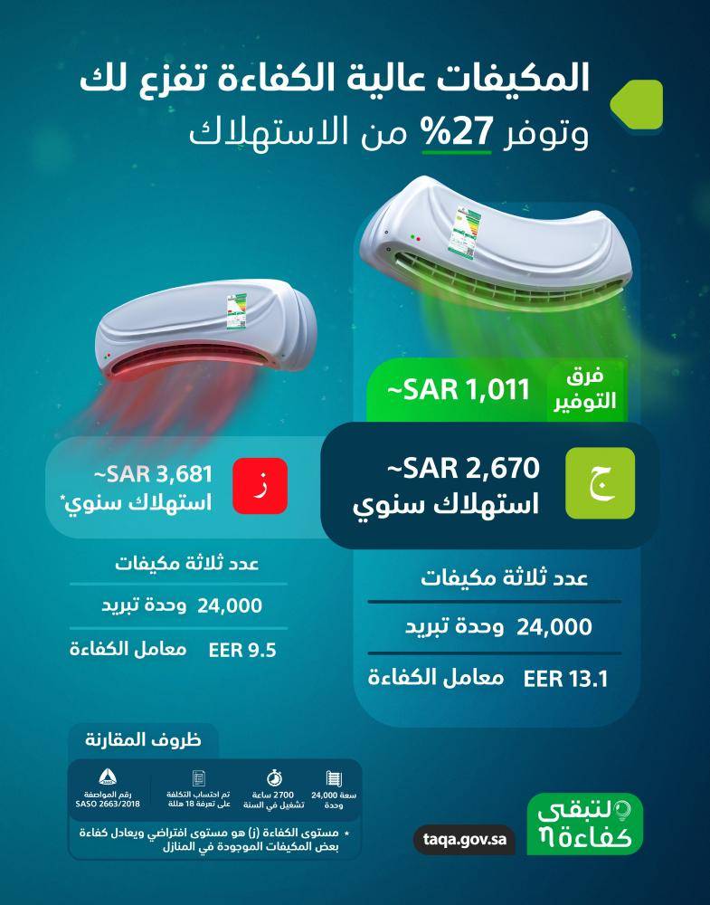كشف المركز السعودي لكفاءة الطاقة، أن أجهزة التكييف المنزلية الإسبليت موفرة للطاقة أكثر من مكيفات الشباك، كما بين المركز أهمية إغلاق الأبواب والنوافذ عند تشغيل المكيف. ورجّح مختصون في المركز السعودي لكفاءة الطاقة، السبب أن حد مستوى كفاءة الطاقة لمكيفات الشباك لا يمكن للصانع أو المصنع زيادته، إذ يصل إلى حد معين فقط، في المقابل فإن مكيفات الإسبليت يمكن للصانع أو المصنع الزيادة في مستوى كفاءة الطاقة. وأكدوا أن فترة توقف المكيفات عن العمل لفترات طويلة يزيد من الترسبات داخل أجهزة التكييف ما يزيد من استهلاك طاقتها أثناء عملها قبل تنظيفها، لافتين إلى أن هناك العديد من المميزات التي ستنعكس إيجاباً على فاتورة الكهرباء بعد أول شهر من الصيانة الدورية لها من خلال تقليل استهلاك الطاقة خصوصا أن أجهزة التكييف تعتبر من أعلى الأجهزة استهلاكا للطاقة بالمنازل. وأكد المركز السعودي لكفاءة الطاقة أنه كلما ارتفع النطاق في بطاقة كفاءة الطاقة الموضوعة على جهاز التكييف إلى الأخضر زادت كفاءته في الحفاظ على الطاقة، حيث إن النطاق ج يستهلك ما يعادل 2670 ريالا سنويا لعدد 3 مكيفات وقدرة 24.000 وحدة تبريد ومعامل الكفاءة EER13.1 بينما المكيفات التي في النطاق ز فإنها تستهلك 3681 ريالا سنويا لعدد 3 مكيفات وقدرة 24.000 وحدة تبريد ومعامل كفاءة EER 9.5 بفرق توفير 1011 ريالا سعوديا.