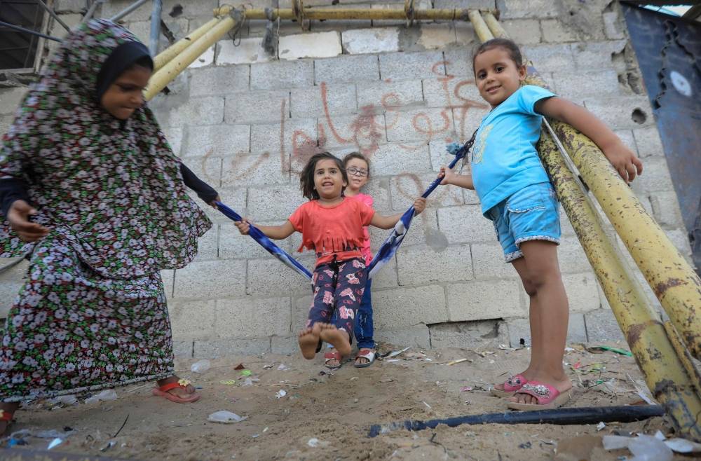 فتيات فلسطينيات يتأرجحن ويلعبن بجوار منزلهن في خان يونس جنوب قطاع غزة. (أ ف ب)