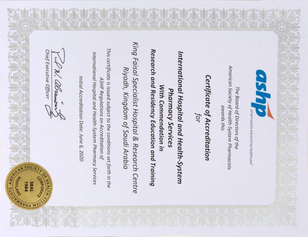 حصل مستشفى الملك فيصل التخصصي ومركز الأبحاث بالرياض ممثلا بقطاع الرعاية الصيدلية على الاعتماد الدولي لخدمات صيدلة المستشفيات والنظام الصحي من الجمعية الأمريكية لصيادلة النظام الصحي (American Society of Health-System Pharmacists-ASHP) كأول مركز طبي عالمي خارج الولايات المتحدة، كما حاز قطاع الرعاية الصيدلية في المستشفى على التميز الخاص في مجالي الأبحاث والتدريب لبرامج الإقامة. ويهدف الاعتماد للاعتراف بالمستشفيات والأنظمة الصحية التي تقدم خدمات صيدلانية مبتكرة عالية الجودة وآمنة وفعالة في جميع أنحاء العالم. وقام فريق تقييم مختص من الجمعية الأمريكية بزيارة مستشفى الملك فيصل التخصصي ومركز الأبحاث بالرياض مطلع شهر مارس من العام الجاري وأجروا تقييماً لمواقع وخدمات الأقسام التابعة لقطاع الرعاية الصيدلية، كما عقدوا اجتماعات مطولة مع الكادر الإداري والطبي والتمريضي خلال الزيارة. وتغطي معايير الاعتماد الدولية عدة مجالات أساسية مثل: القيادة والإدارة، الجودة، سياسة الدواء والمعلومات الدوائية، سلامة الدواء، إدارة المعلومات، سلاسل الإمداد الدوائية، خدمات الصيدلة السريرية، التعليم والتدريب. وقال مدير عام قطاع الرعاية الصيدلية بمستشفى الملك فيصل ومركز الأبحاث بالرياض الدكتور عبدالرزاق الجزائري إن هذا الاعتماد من شأنه تعزيز التطوير المستمر في صيدليات المستشفى المختلفة، بما ينعكس على جودة الخدمات المقدمة للمرضى تماشياً مع المستشفيات المتقدمة في الولايات المتحدة الأمريكية لافتاً إلى أن هذا الاعتراف يمثل علامة فارقة على تميز الخدمات الصيدلانية في المستشفى.