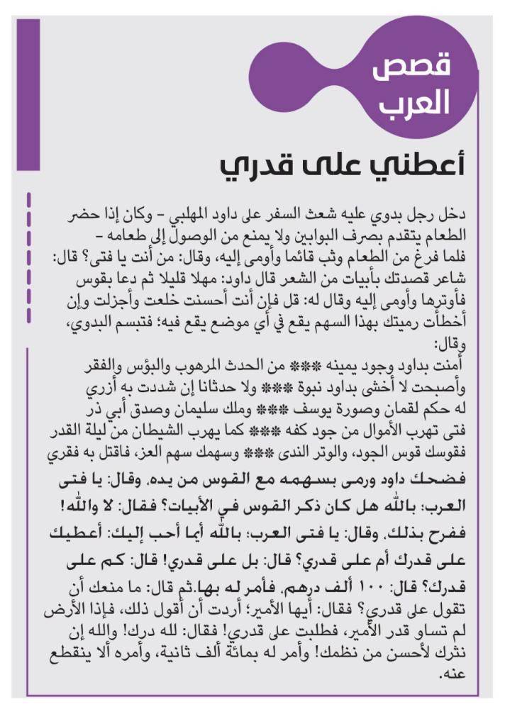 فضحك داود ورمى بسهمه مع القوس من يده، وقال: يا فتى العرب؛ بالله هل كان ذكر القوس في الأبيات؟ فقال: لا والله! ففرح بذلك، وقال: يا فتى العرب؛ بالله أيما أحب إليك: أعطيك على قدرك أم على قدري؟ قال: بل على قدري! قال: كم على قدرك؟ قال: 100 ألف درهم، فأمر له بها.ثم قال: ما منعك أن تقول على قدري؟ فقال: أيها الأمير؛ أردت أن أقول ذلك، فإذا الأرض لم تساو قدر الأمير، فطلبت على قدري! فقال: لله درك! والله إن نثرك لأحسن من نظمك! وأمر له بمائة ألف ثانية، وأمره ألا ينقطع عنه.