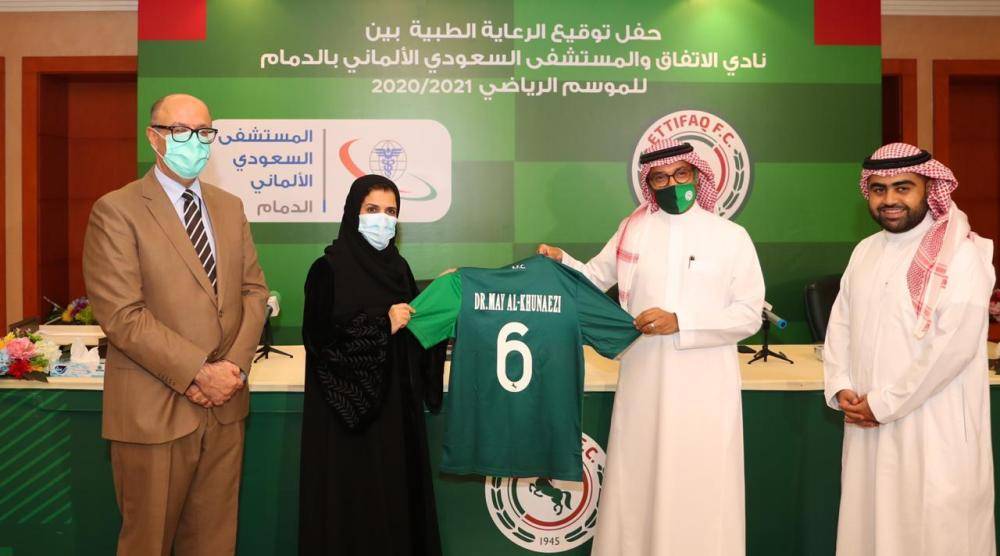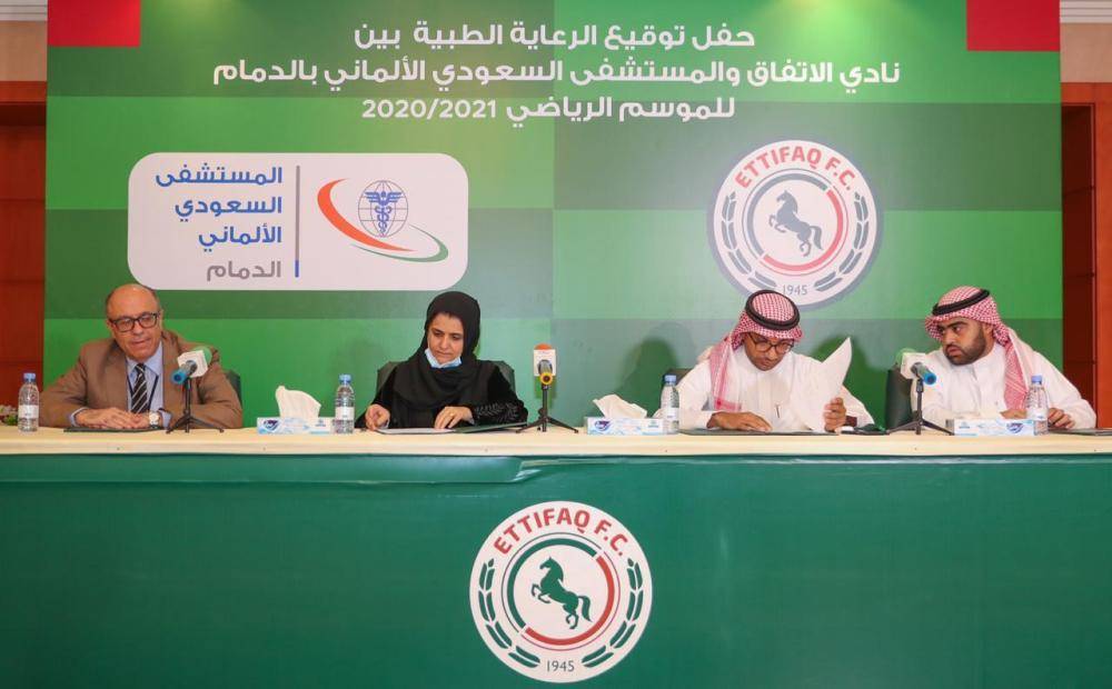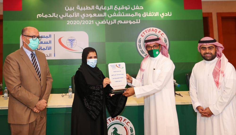 من جهته أكد رئيس الاتفاق خالد الدبل أن التوقيع مع المستشفى السعودي الألماني راعيا طبيا جاء لعراقته في الخدمة الطبية بالمملكة، ولإمكانياته الكبيرة في التأهيل الرياضي، وقال «نفخر بتوقيعنا لعقد الرعاية الطبية مع المستشفى السعودي الألماني بالدمام هذا الكيان الطبي الشامخ والعريق بتاريخه الممتد، المعروف بإمكانياته الكبيرة وبكوادره المتخصصة»، وأضاف «هذه الرعاية هي اتفاق لوضع اللبنة الأولى لشراكة ممتدة، ورسم الملامح الأولى لإستراتيجية طويلة، نأمل فيها أن نكون للمستشفى السعودي الألماني بعد تأسيسه وبداية تشغيله في الدمام بوابة ناجحة، للوصول إلى شريحة عريضة وكبيرة من شرائح المجتمع في المنطقة الشرقية خاصة». في المقابل أكدت المدير التنفيذي للمستشفى السعودي الألماني بالدمام الدكتورة مي الخنيزي أن نادي الاتفاق معرف بعراقته وبطولاته على مستوى المملكة وليس فقط في المنطقة الشرقية، وهو الأمر الذي جعل المستشفى الألماني يبرم معه اتفاقية الرعاية الطبية.