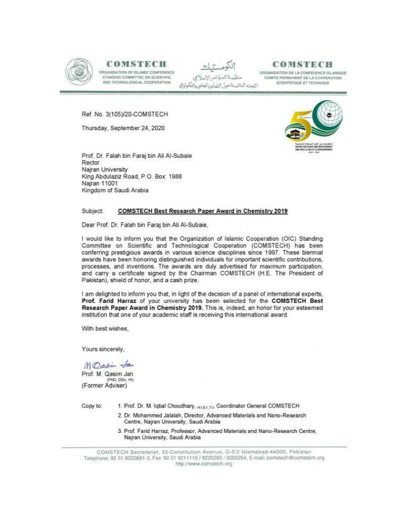 وأوضح وكيل الجامعة للدراسات العليا والبحث العلمي، الدكتور سعيد السريعي، أن اللجنة الدائمة للتعاون العلمي والتكنولوجي التابعة لمنظمة التعاون الإسلامي "كومستيك" تمنح هذه الجوائز للتميز في العلوم والتكنولوجيا بهدف تشجيع ودعم المساهمات العلمية في مجال العلوم الأساسية، مشيراً إلى أنه اُستشهد بهذا البحث كمرجع علمي 99 مرة حتى أكتوبر 2020.