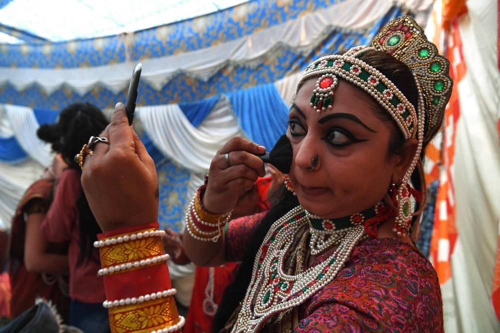فنانة تستعد قبل أداء دراما تقليدية، خلال احتفالات مهرجان دوسيهرا، في نيودلهي. (أ ف ب)