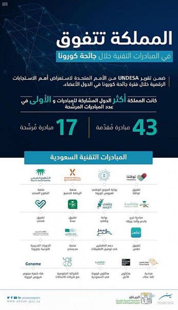 وجاءت المملكة العربية السعودية في مقدمة الدول الأكثر مشاركة للمبادرات الرقمية الوطنية خلال فترة الجائحة، والأولى من حيث عدد المبادرات المرشحة بواقع 17 مبادرة تنوعت في خِدْماتها ومجالات عملها، من بينها المنصة الإلكترونية لمركز التطوع الصحي.