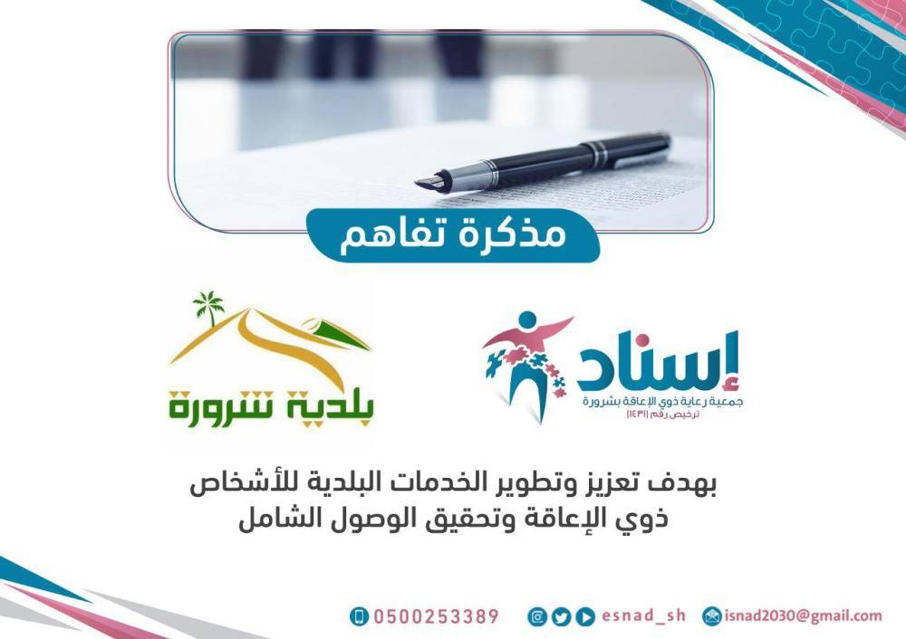 وقّع رئيس مجلس إدارة جمعية إسناد لرعاية الأشخاص ذوي الإعاقة عامر النهدي ورئيس بلدية شرورة محمد آل فهاد بحضور مدير الجمعية طارق الهمامي، في مقر بلدية شرورة، مذكرة تفاهم لتعزيز وتطوير الخدمات البلدية للأشخاص ذوي الإعاقة وتحقيق الوصول الشامل. وأكد مدير الجمعية أنها بدأت نشاطها لرعاية الأشخاص ذوي الإعاقة منذ 10 شهور بناء على الاحتياج لخدمات الرعاية والتأهيل والعلاج والتمكين والوصول الشامل.