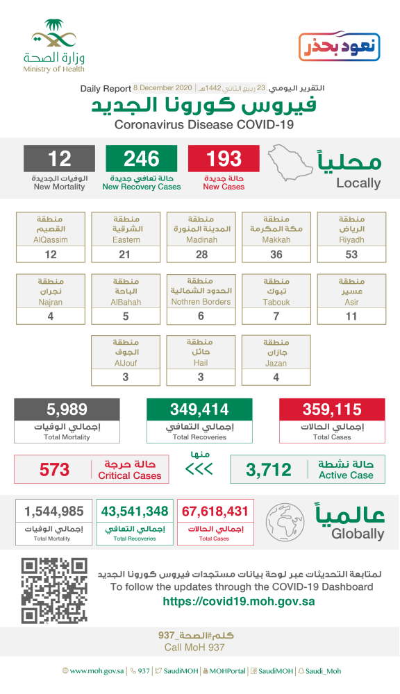 وبلغ عدد الوفيات 5989، بإضافة 12 وفاة جديدة. ولفتت الوزارة إلى أنه تم إجراء 44601 فحص مخبري جديد خلال الـ 24 ساعة الماضية، فيما يوضح الجدول المرفق توزيع الحالات الجديدة في مناطق المملكة، وكذلك أعداد الإصابة والتعافي والوفيات عالميا.