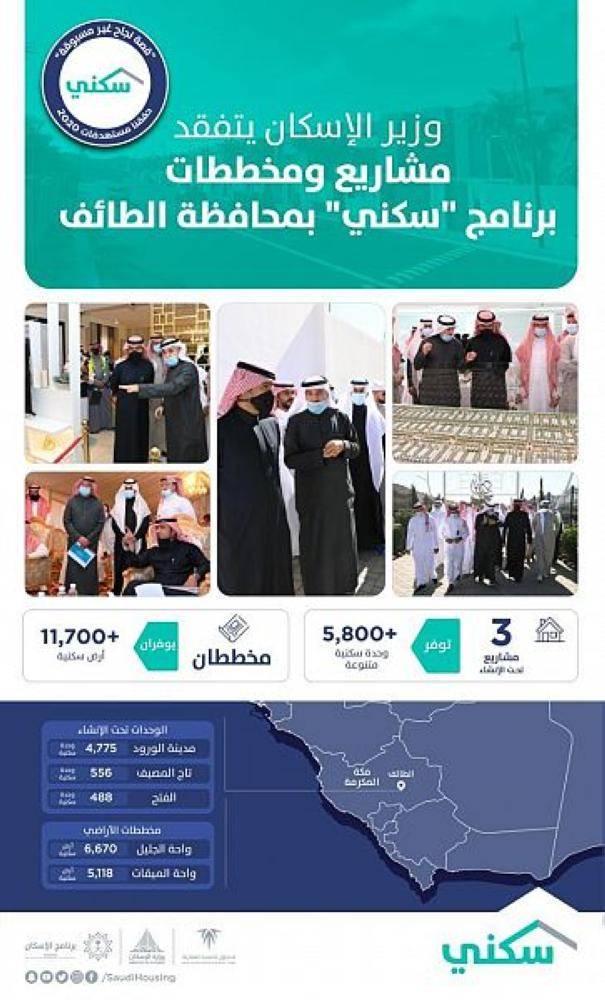 ويعد مشروع «مدينة الورود» في الطائف أكبر المشاريع السكنية تحت الإنشاء في المحافظة لما يضمه من وحدات سكنية يصل عددها إلى 4775 فيلا تقع داخل النطاق العمراني على طريق السيل، ويتميز المشروع كونه ضاحية سكنية متكاملة الخدمات والمرافق، ويتم تنفيذ المشروع بأحد أحدث أساليب البناء (القوالب النفقية TF)، ويبعد نحو 10 دقائق عن قلب الطائف والمنطقة المركزية، وحوالي 15 دقيقة عن جامعة الطائف، ونحو 20 دقيقة عن مطار الطائف ومنطقة الهدا. كما تشهد محافظة الطائف تنفيذ ثلاثة مشاريع سكنية تحت الإنشاء بالشراكة مع المطورين العقاريين، تتميز بمواقعها الإستراتيجية في قلب الطائف، منها مشروع «تاج المصيف» الذي يقع في وسط المحافظة في حي الرحاب على مساحة تُقدر بأكثر من 440 ألف م2، ويبعد 10 دقائق عن جامعة الطائف ومستشفى الملك سلمان الجديد وحوالي 15 دقيقة عن مطار الطائف الدولي متوسطاً جميع الخدمات والمواقع المهمة في محافظة الطائف، ويتميز المشروع الذي يضم 556 فيلا سكنية تتراوح مساحاتها ما بين 300-400م2 بتصاميم عصرية مميزة تراعي احتياجات المواطنين وثقافة المجتمع السعودي ضمن ثلاثة نماذج (الماسة والياقوتة والزمردة)، إضافة إلى الحداثة العمرانية وتكامل الخدمات من حدائق ومرافق صحية وتعليمية وتجارية وشوارع واسعة وبنية تحتية متكاملة. وتضّم الطائف مشروع «الفتح» الذي يوفّر 488 وحدة سكنية ما بين شقق وفلل تقع على مساحة تزيد على 109 آلاف متر مربع في حي السيل الصغير متوسطاً طريق الرياض والسيل بالقرب من المواقع الحيوية كمطار الطائف الدولي وجامعة الطائف وغيرها من المرافق والخدمات، ويتكون المشروع من 95 عمارة سكنية من دورين تضم 5 وحدات سكنية وعدد من الفلل السكنية متنوعة المساحات والنماذج. وعلى مستوى المخططات، تتضمن محافظة الطائف مخططين للأراضي السكنية هما «واحة الجليل» الذي يوفر 6670 قطعة أرض، و«واحة الميقات» الذي يوفر 5118 قطعة أرض، حيث أصدرت عقود الأراضي عبر موقع وتطبيق «سكني»، فيما بدأت أعمال البناء الذاتي من قبل المستفيدين.