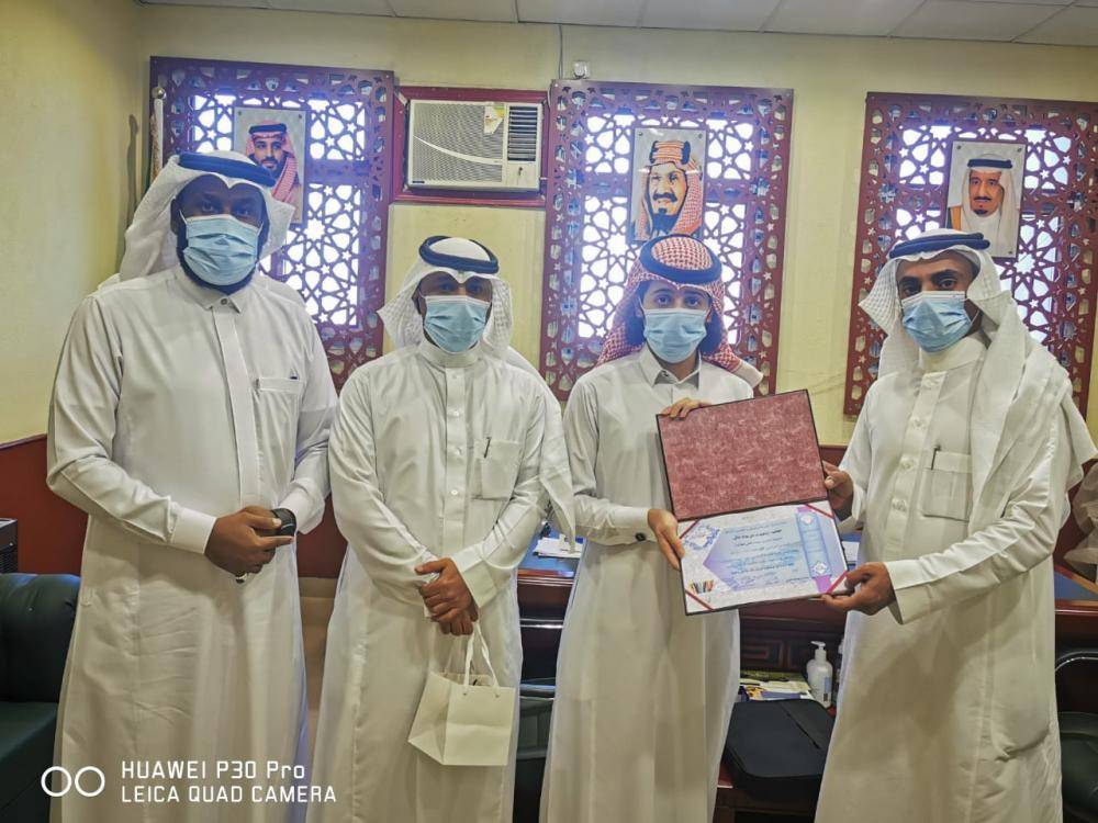 كرم قائد مدرستي عبدالله السائب الابتدائية، وهشام بن حكيم المتوسطة، خالد السلمي، بحضور وكيل المدرسة عابد الشريف، ومعلم مادة لغتي مبارك القرني، الطالب إبراهيم علي المالكي؛ لتفوقه في مادة لغتي.