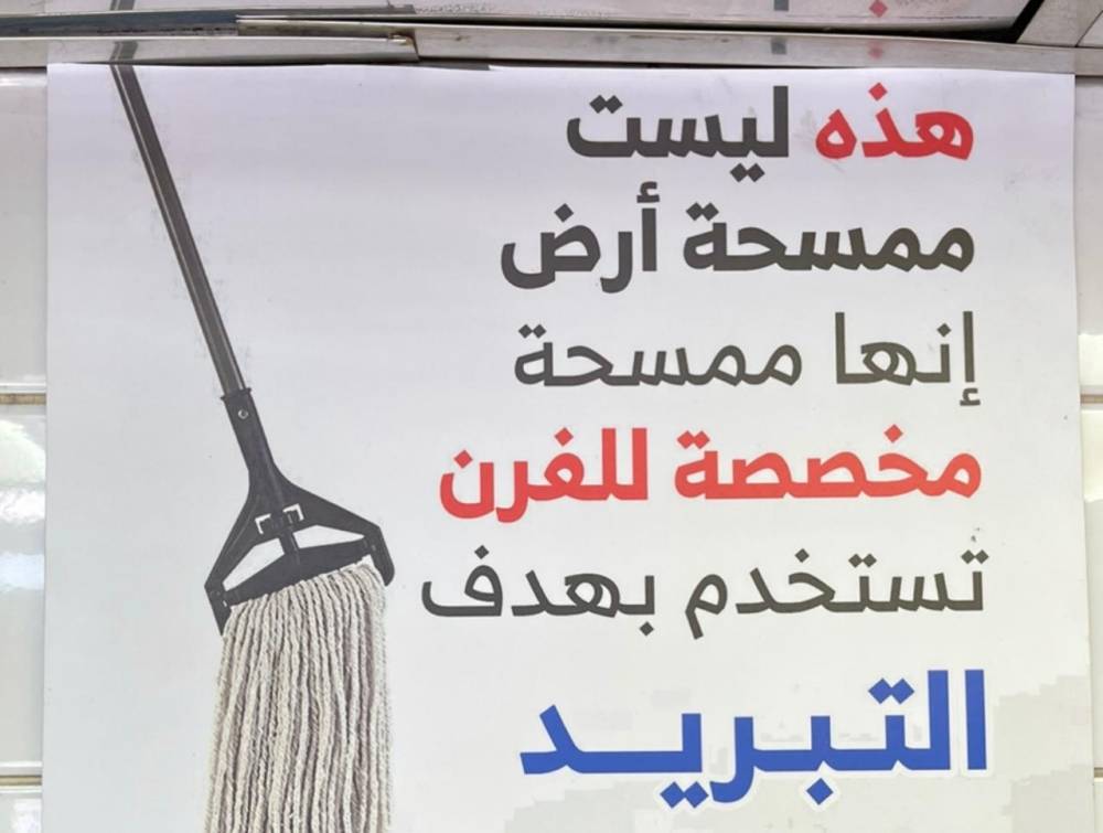 وقال صاحب المخبز لـ«الوطن» إنه اضطر لوضع لافتة مكتوبا عليها «هذه ليست ممسحة أرض إنها ممسحة مخصصة للفرن وتستخدم بهدف التبريد» تفاديا للدخول في نقاشات حادة مع بعض الزبائن الذين يقومون فورا منذ رؤيتهم للعامل يستخدم الممسحة إما بتوثيق الموقف بالتصوير ورفع بلاغ أو تقديم شكوى لدى الجهات المعنية.
