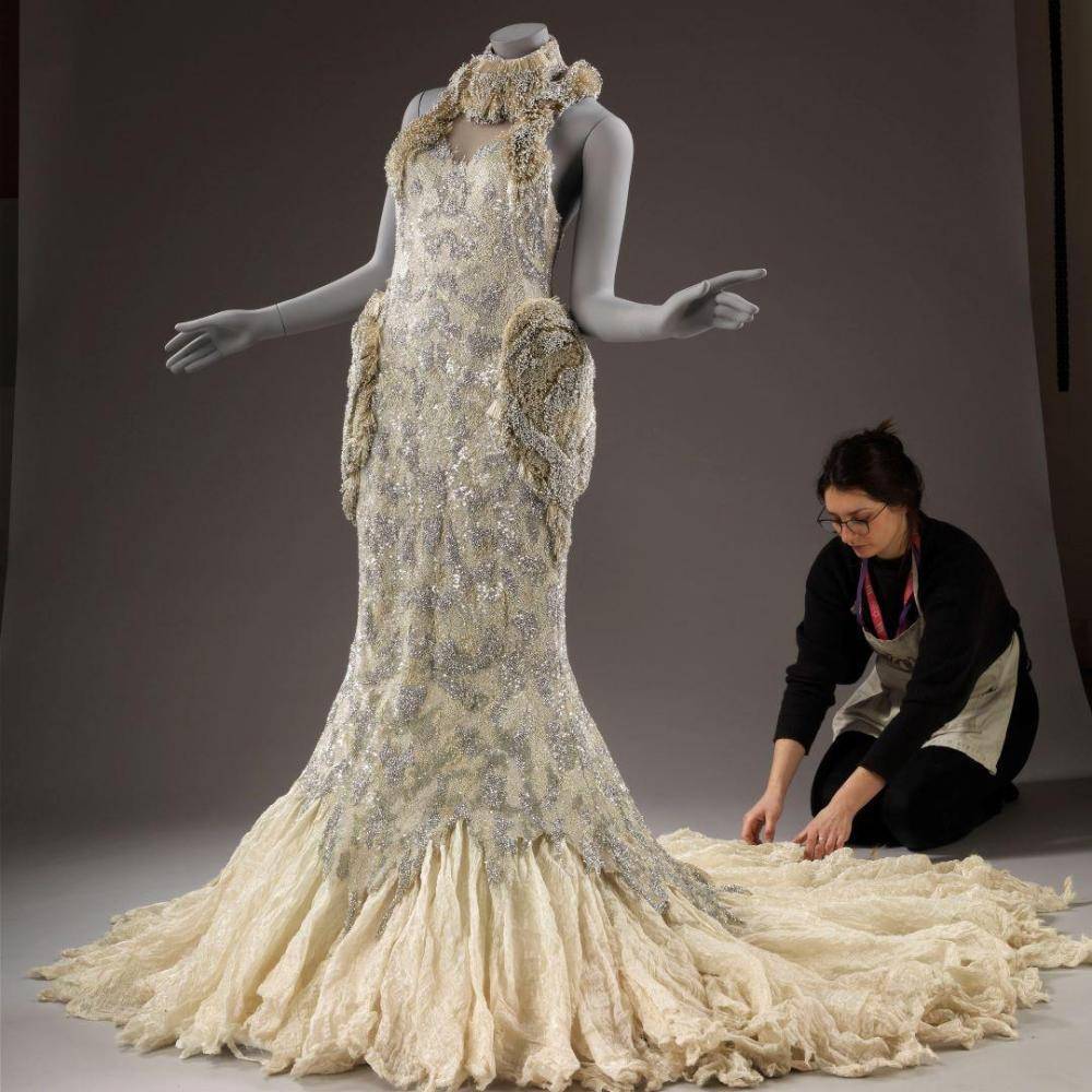 سيدة تستغرق يومين في تركيب فستان من تصميم «سارة بيرتون»، من أجل التقاط الصور. (Victoria and Albert Museum)