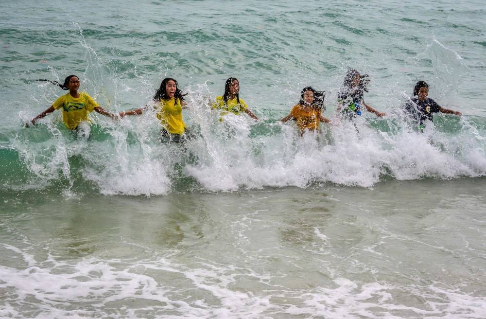 أطفال يلعبون على شاطئ في كوه ساموي على خليج تايلاند، مستمتعين بالأمواج العالية. (أ ف ب)