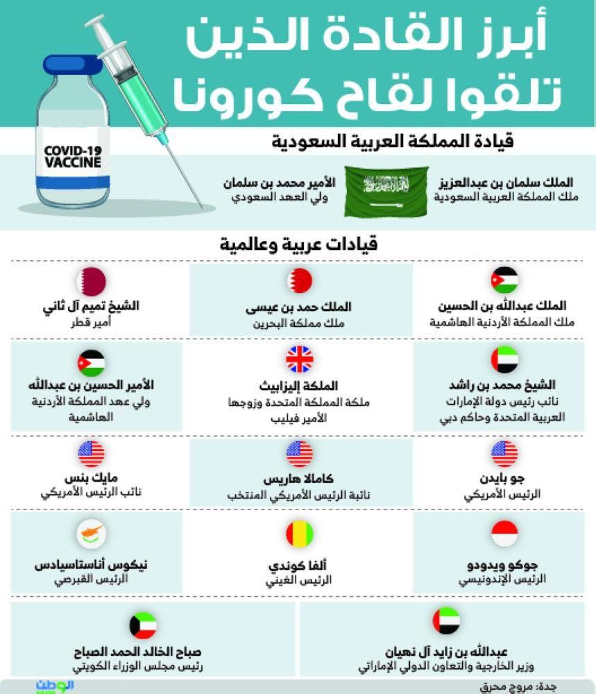 *قيادة المملكة العربية السعودية - الملك سلمان بن عبدالعزيز ملك المملكة العربية السعودية - الأمير محمد بن سلمان ولي العهد السعودي *قيادات عربية وعالمية - الملك عبدالله بن الحسين ملك المملكة الأردنية الهاشمية - الملك حمد بن عيسى ملك مملكة البحرين - الشيخ تميم آل ثاني أمير قطر - الشيخ محمد بن راشد نائب رئيس دولة الإمارات العربية المتحدة وحاكم دبي - الملكة إليزابيث ملكة المملكة المتحدة وزوجها الأمير فيليب - الأمير الحسين بن عبدالله ولي عهد المملكة الأردنية الهاشمية - الرئيس الأمريكي جو بايدن - نائبة الرئيس الأمريكي المنتخب كامالا هاريس - نائب الرئيس الأمريكي مايك بنس - الرئيس الإندونيسي جوكو ويدودو - الرئيس الغيني ألفا كوندي - الرئيس القبرصي نيكوس أناستاسيادس - عبدالله بن زايد آل نهيان وزير الخارجية والتعاون الدولي الإماراتي - صباح الخالد الحمد الصباح رئيس مجلس الوزراء الكويتي