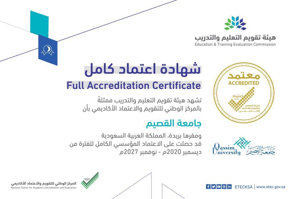 وأوضح «الحربي» أن الجامعات تلجأ لتحقيق هذا لجهات مستقلة تعنى بتطبيق مفاهيم ومعايير الجودة لتحكم على أدائها بصورة مستقلة ومن منظور محايد، منوها إلى أن هذا ما عملت عليه جامعة القصيم من خلال حصولها على الاعتماد المؤسسي الكامل 2020-2027 من هيئة تقويم التعليم والتدريب، متمثلة بالمركز الوطني للتقويم والاعتماد الأكاديمي، ومبينا أن هذا الإنجاز جاء ليجدد الثقة بالجامعة وبرامجها وعملها المؤسسي في ضبط عملياتها الأكاديمية لسبع سنوات قادمة. وكانت الجامعة استوفت كافة المعايير والمتطلبات اللازمة للحصول على تجديد الاعتماد الأكاديمي وهي: إعداد المؤسسة التعليمية لتقارير دراسة تقويم ذاتية دقيقة وشاملة لكل أوجه النشاطات العلمية والإدارية والخدمية لتحديد مستويات الجودة لديها، وذلك استنادا على معايير الاعتماد المعدة من قبل هيئة تقويم التعليم والتدريب، وأن تخضع لتقويم خارجي من قبل فريق تقويم مستقل، للتحقق من صحة نتائج دراسة التقويم الذاتية، والحكم على مستويات جودة الأداء وفقا لمعايير الهيئة، كما يتعين قبل البدء في عمليات الاعتماد أن يثبت استيفاء العناصر الرئيسة في معايير ضمان الجودة والاعتماد الأكاديمي، والمسوغات النظامية لممارسة عملها.