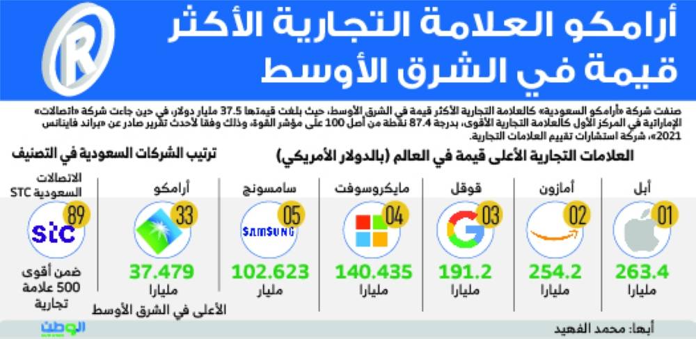 صنفت شركة «أرامكو السعودية» كالعلامة التجارية الأكثر قيمة في الشرق الأوسط، حيث بلغت قيمتها 37.5 مليار دولار، في حين جاءت شركة «اتصالات» الإماراتية في المركز الأول كالعلامة التجارية الأقوى، بدرجة 87.4 نقطة من أصل 100 على مؤشر القوة، وذلك وفقا لأحدث تقرير صادر عن «براند فاينانس 2021»، شركة استشارات تقييم العلامات التجارية.