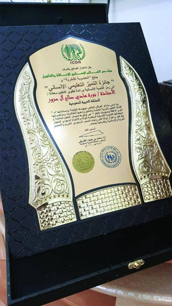 منح مجلس العالم الإسلامي للإعاقة والتأهيل، العضوية الشرفية للمعلمة نورة هادي آل سرور، من إدارة تعليم نجران، نظير جهودها ومساندتها قضايا التعليم والتربية الخاصة والتأهيل.