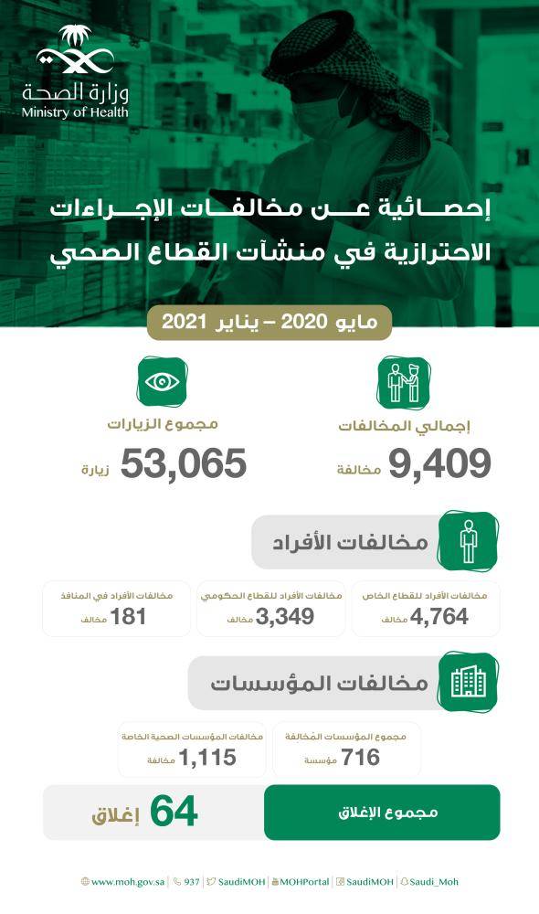 وبلغ مجموع المؤسسات المخالفة 716 مؤسسة، بينما بلغ مجموع مخالفات المؤسسات الصحية الخاصة 1115. وأكدت الصحة أن زياراتها الرقابية التوعوية اليومية تم تكثيفها بهدف رفع مستوى التزام المؤسسات الصحية في المستشفيات والمجمعات والصيدليات والمؤسسات الصحية الأخرى، والتأكد من التزامها بالإجراءات الوقائية والاحترازية للوقاية من فيروس كورونا Covid-19 بما فيها الالتزام بلبس الكمامة والتباعد الجسدي وكذلك تطبيق الاشتراطات الصحية وآليات الممارسة الصحية المعتمدة لإدارة هذه الأزمة وتوفير المتطلبات اللازمة لسلامة المرضى. وأشارت إلى التوسع في مهام فريق الالتزام بوزارة الصحة والتي تشرف عليه الوكالة المساعدة للالتزام، حيث تشمل الرقابة على المحاجر الصحية في جميع مناطق المملكة بالتوازي مع تكثيف الزيارات الرقابية للمستشفيات العامة التابعة لوزارة الصحة للتأكد من التزامها بالاشتراطات الصحية.