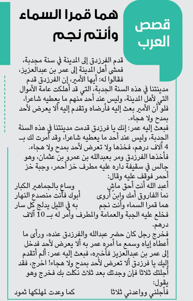 قدم الفرزدق إلى المدينة في سنة مجدبة، فمشى أهل المدينة إلى عمر بن عبدالعزيز، فقالوا له: أيها الأمير، إن الفرزدق قدم مدينتنا في هذه السنة الجدبة، التي قد أهلكت عامة الأموال التي لأهل المدينة، وليس عند أحد منهم ما يعطيه شاعرا، فلو أن الأمير بعث إليه فأرضاه وتقدم إليه ألا يعرض لأحد بمدح ولا هجاء.