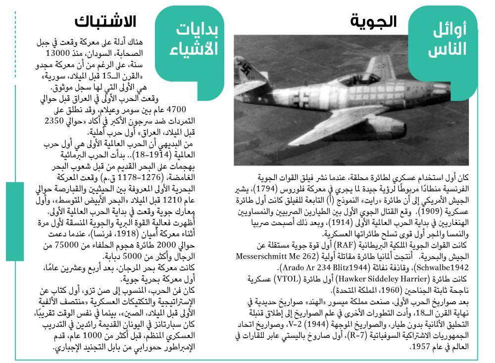 من البديهي أن الحرب العالمية الأولى هي أول حرب العالمية (1914-18).. بدأت الحرب البرمائية بهجمات على البحر القديم من قبل شعوب البحر الغامضة، (1276-1178 ق.م) وقعت المعركة البحرية الأولى المعروفة بين الحيثيين والقبارصة حوالي عام 1210 قبل الميلاد «البحر الأبيض المتوسط»، وأول معارك جوية وقعت في بداية الحرب العالمية الأولى.